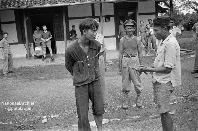 Foto seorang pejuang yang tertangkap dan menjadi tawanan pasukan Belanda, tampak kedua tangan terikat dengan tali, namun tatapan matanya tajam dan tak sedikitpun menunjukkan rasa takut, walaupun nyawanya akan segera terpisah dari tubuhnya.